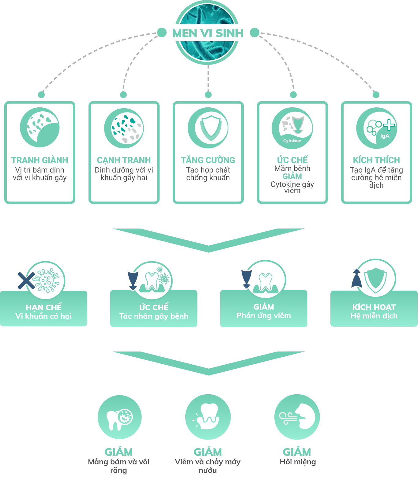 Sử dụng men vi sinh hằng ngày cung cấp lượng lớn lợi khuẩn có thể khôi phục được sự cân bằng vi sinh vật, từ đó tái tạo hệ sinh thái khỏe mạnh trong môi trường miệng. Việc sử dụng liệu pháp sinh học bổ sung men vi sinh này được gọi là liệu pháp vắc xin vi khuẩn. Liệu pháp này được cho là tối ưu ngoài tính hiệu quả còn bởi độ an toàn, khi chỉ sử dụng các lợi khuẩn sống được tìm thấy trong chính cơ thể người, không kèm theo dược liệu hay các thành phần kích ứng. Phù hợp sử dụng lâu dài cho tất cả các đối tượng